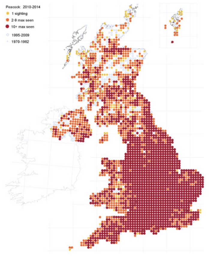 Peocock butterflies are common all over the UK as seen in the graph below!
