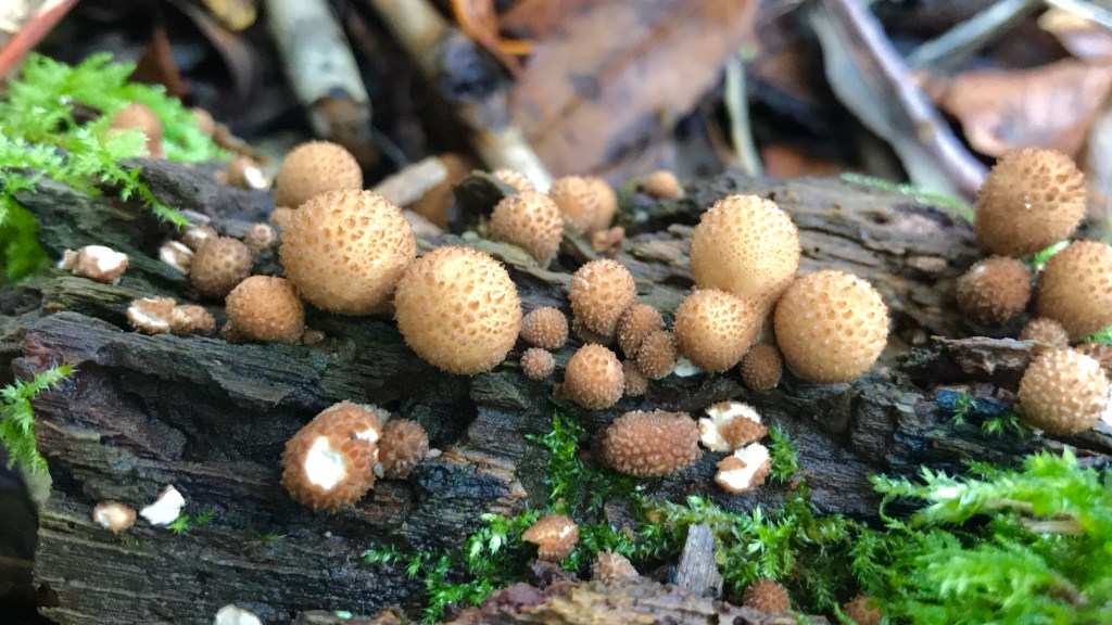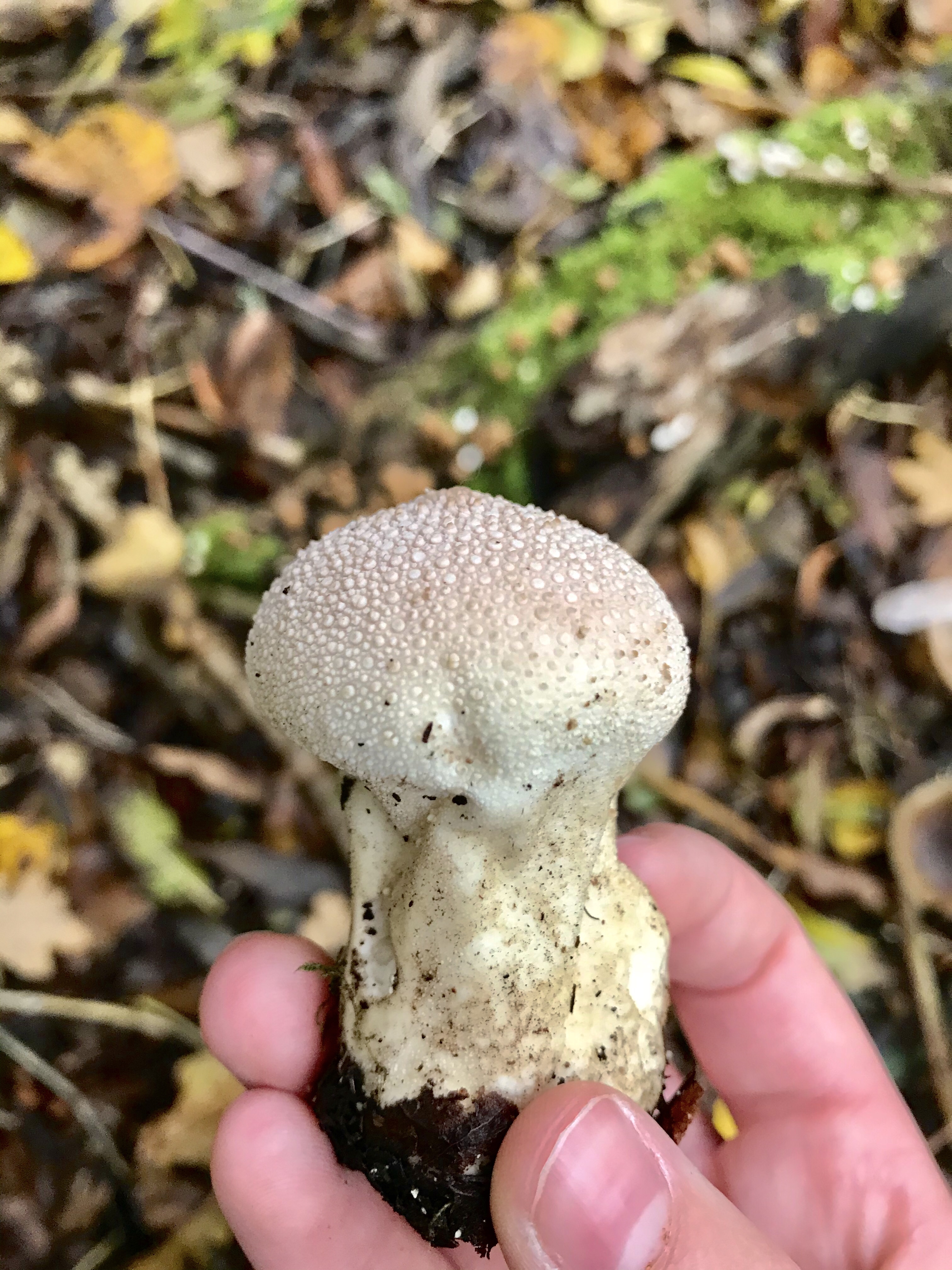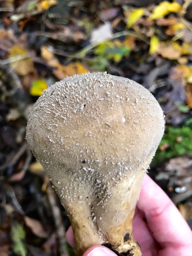 PEDESTAL PUFFBALL – this puffball can be easily confused with earthballs which look similar on the outside but are black on the inside and are poisonous!
