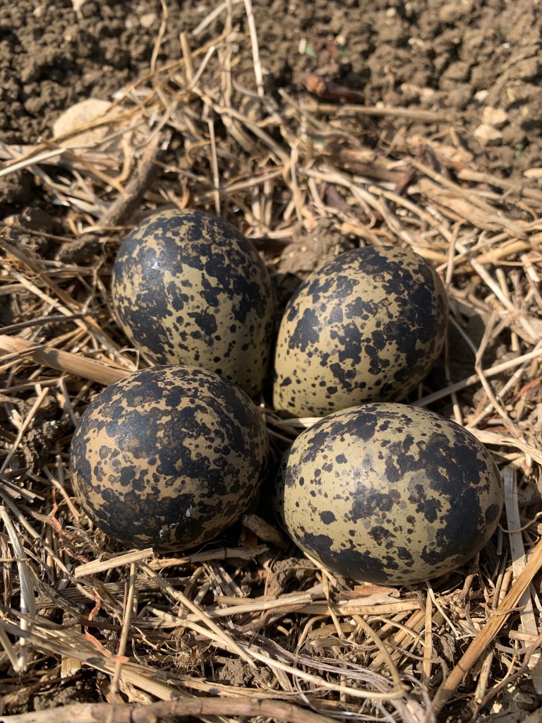 Lapwing nest – Lapwings nest on spring-tilled arable land or on short grassland with a low stocking rate. The nest is a scrape in the ground, lined with a variable amount of plant material.