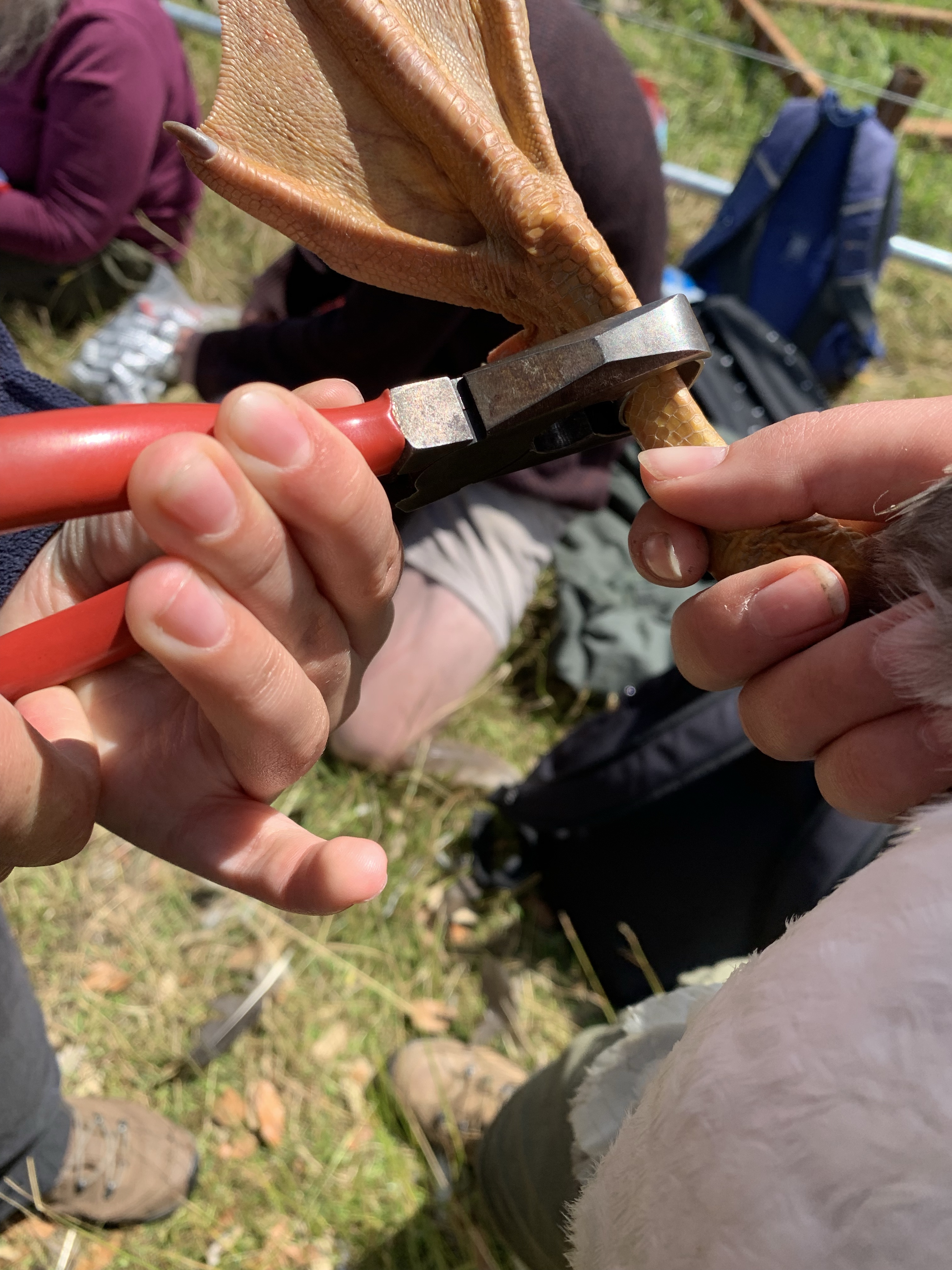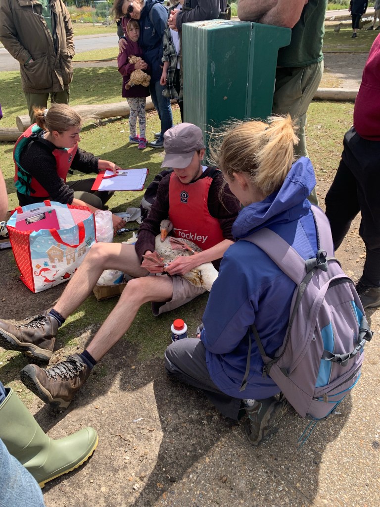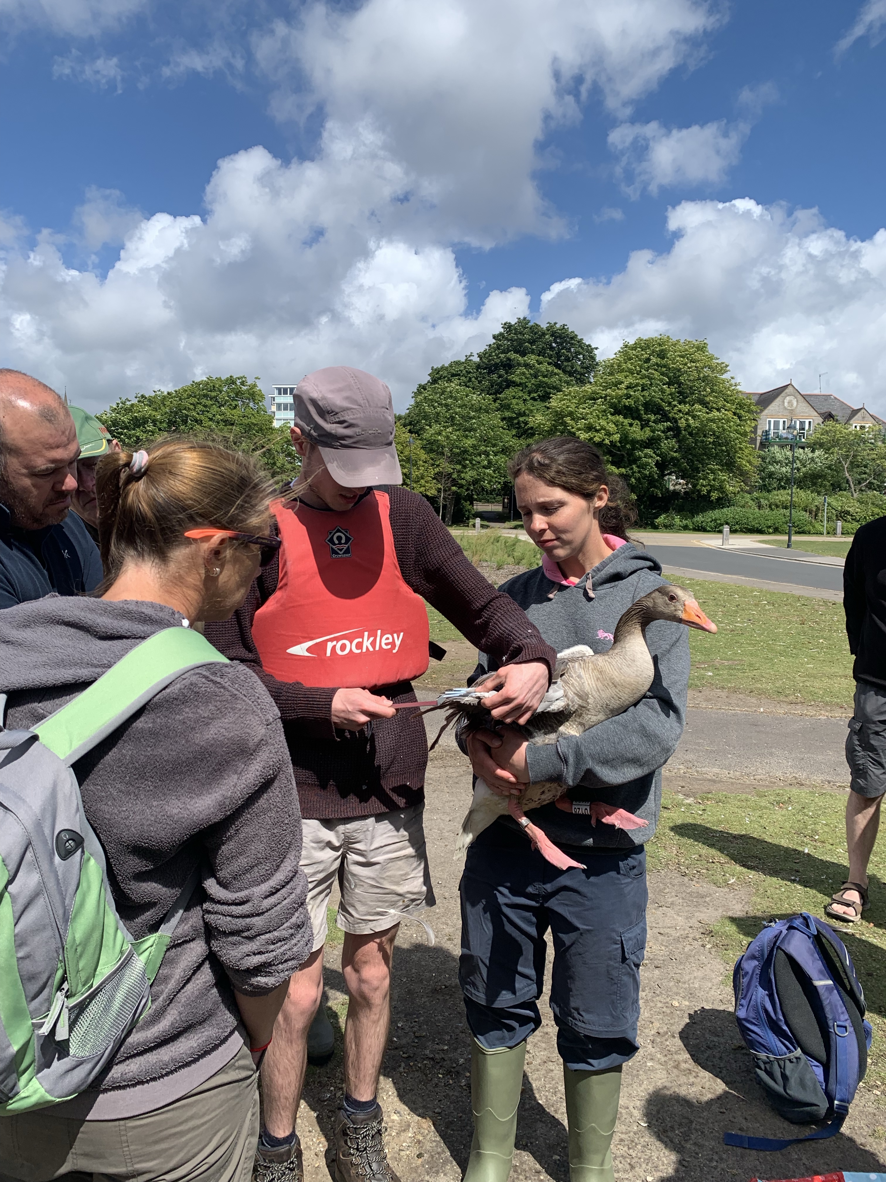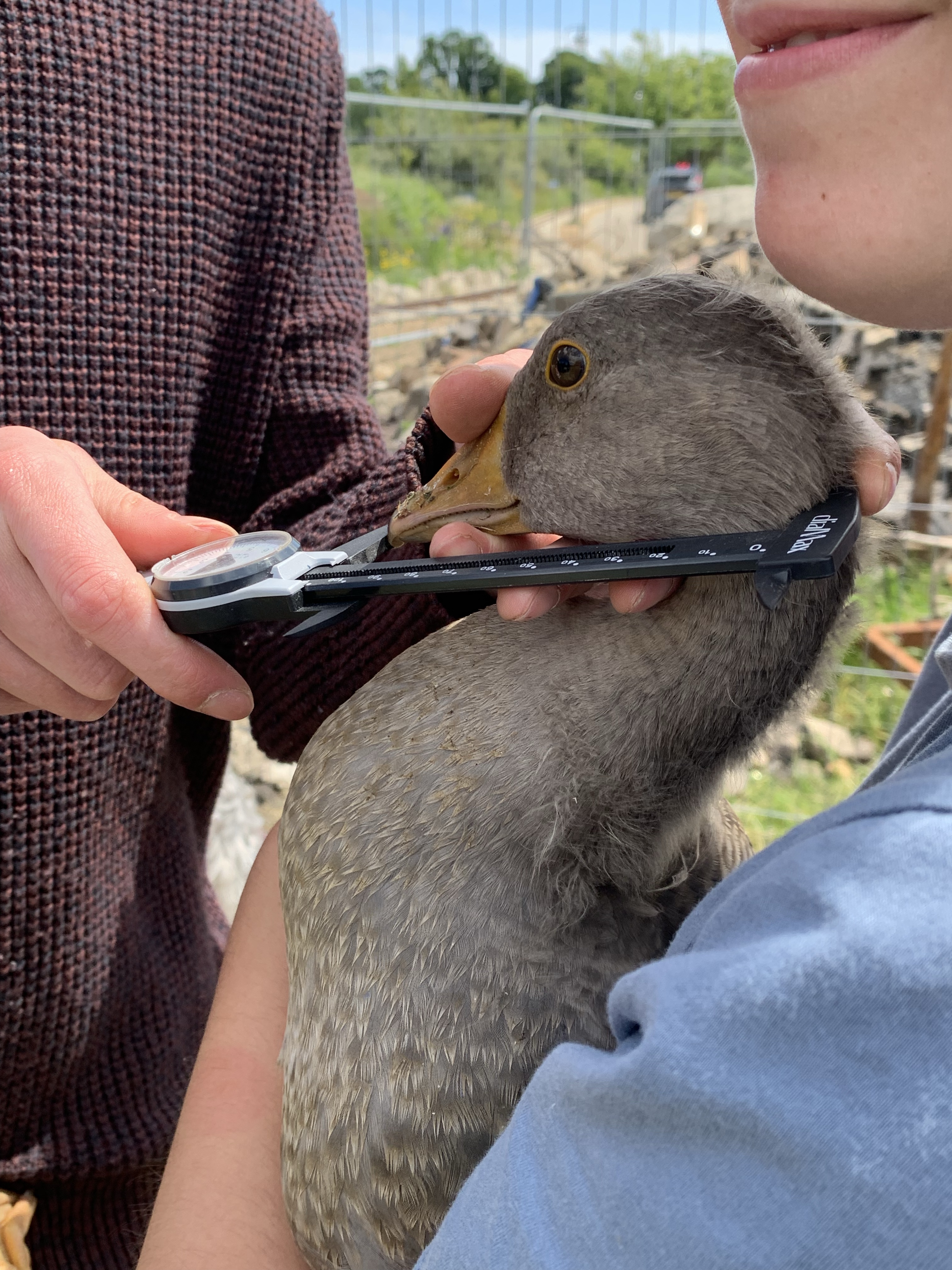 I had the opportunity to ring 2 goslings, which was a great experience to practise ringing and handling larger, stronger birds than the smaller songbirds I usually ring! Once they have been ringed with one metal and one colour ring, some biometrics are taken: the length of the head, the length of the tarsus (between what appears to be a backward-facing ‘knee’ and what appears to be an ‘ankle’) and the length of the second primary feather.