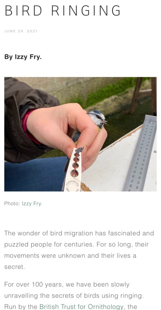 I had a lovely talk with A little bird company about what I get up to and the bird ringing and volunteering I do! Read more here: https://alittlebirdcompany.co.uk/2021/08/01/lets-learn-about-bird-ringing-with-izzy-fry/
