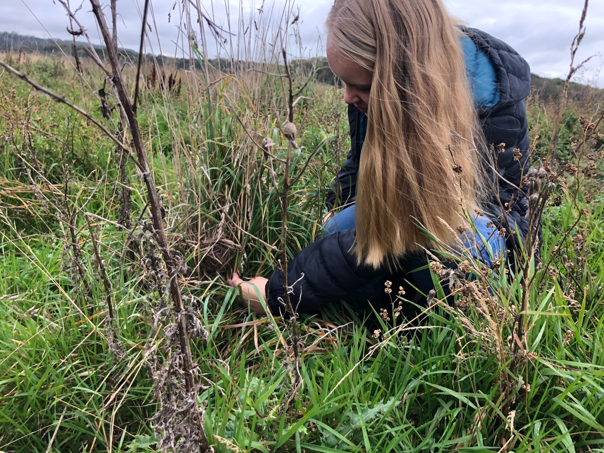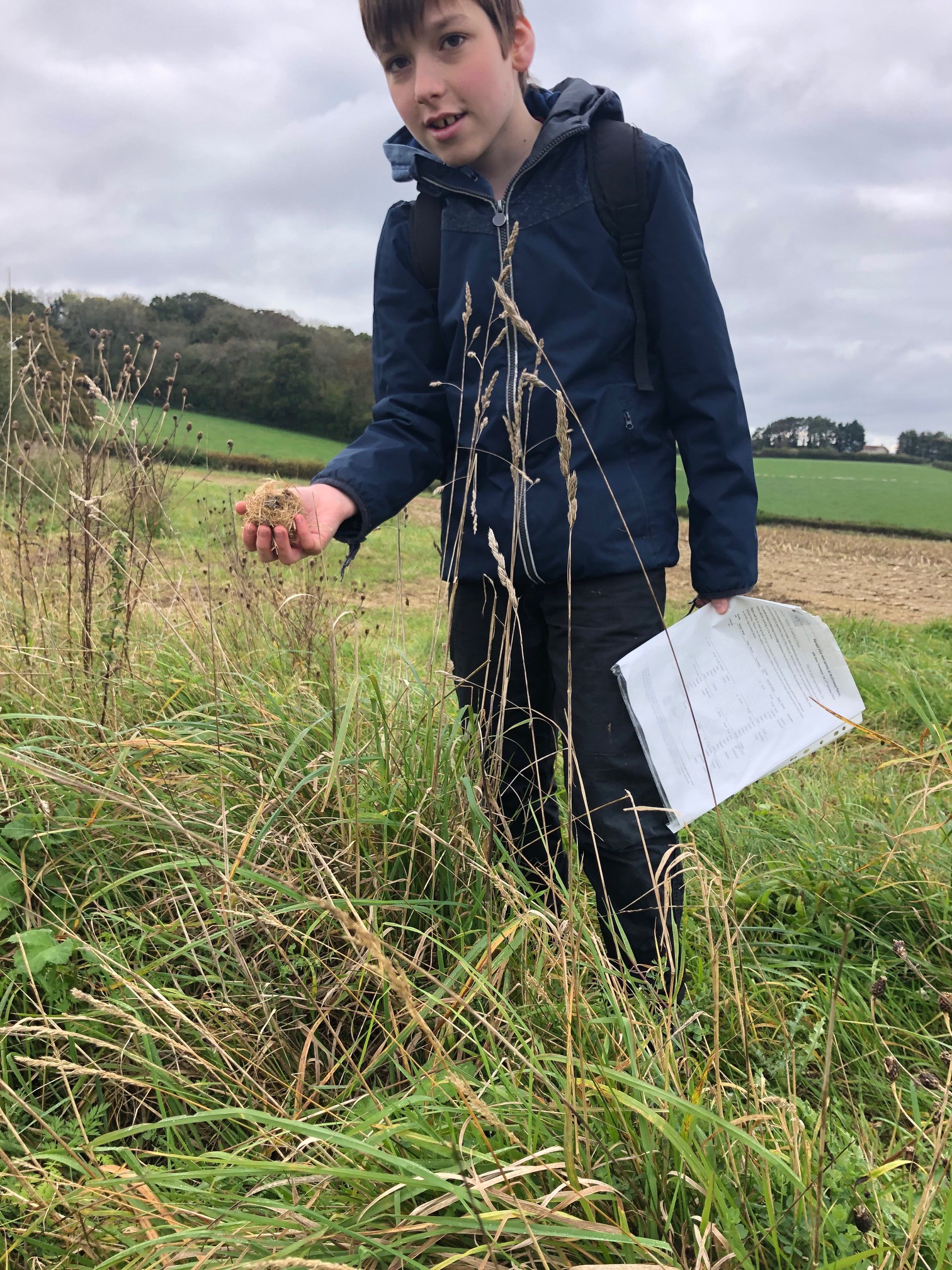Our harvest mice survey, took place in a grassy field margin on Peter Shallcross’s (the Tisbury Natural History’s Chair) farm. The aim was to find lots of old nests, which were built in the summer! Their nests are about the size of a tennis ball, and built into the stems of tough grasses and other flowers, usually about a foot up from the ground and often below brambly hedges or in reeds near round ponds.